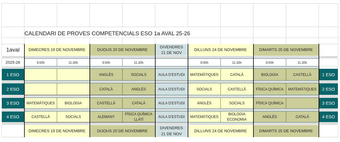 Calendari Proves Competencials 1a Avaluació ESO Curs 25-26
